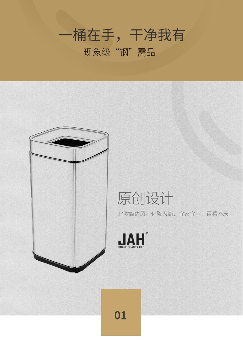 公司創立“潔安惠”品牌(英文“JAH”),正式進軍品牌市場,以智能感應垃圾桶這一產品為主要載體,將家居生活同智能化完美結合。經過潔安惠人鍥而不舍的努力,公司高端垃圾桶產品線不斷擴展與延伸,目前已發展成為國內知名的高端和智能垃圾桶生產商及品牌商。