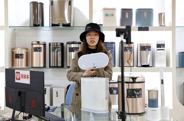 ▲在潔安惠的產品樣品間,主播正在介紹他們為拼多多用戶定制的一款具備IPX5級別防水功能的垃圾桶。(攝影:小南)